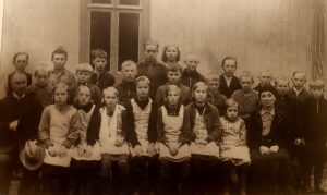 Lärare Ferdinand Lindroos t.v. med sina elever utanför skolan i Mossala. T.h. fru Lindroos som hade hand om undervisningen i handarbete för flickor. (Mårtensson 2000, 105, Houtskärs lokalhistoriska arkiv)