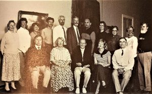 Gymnasiets lärarkår hösten 1990. Sittande från vänster: Folke Nyberg,Asta Martelin, Elof Nyman, Gunilla Backman, Stig-Björn Holmsten. Stående från vänster: Bodil Lund, Christina Stolpe, Carita Heikkiilä, Markus Björkell, Lars Wikström, Göran Westerlund, Christer Sandvik, Maria Grandell-Strömgård, Annina Kyrklund, Wiola Lönnberg, Volmar Rosengren. (Bild Nyberg 1991,197)