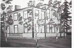 Östermyra folkskola vid ett av torghörnen mitt i köpingen Seinäjoki i hörnet av Kalevalankatu och Koulukatu var ursprungligen en bondstuga som fick en extra andra våning. (Jossfolk1979, 69)